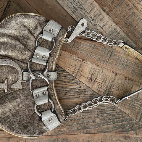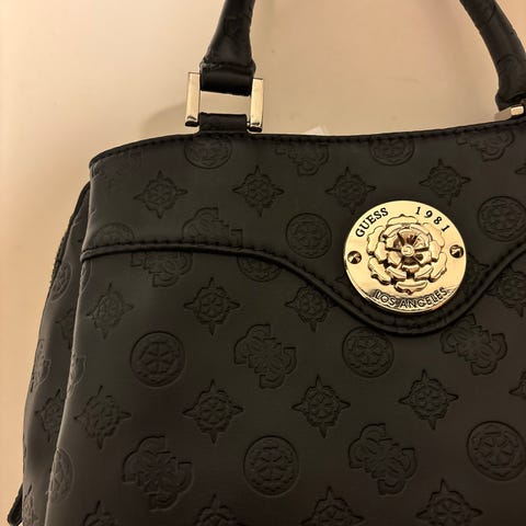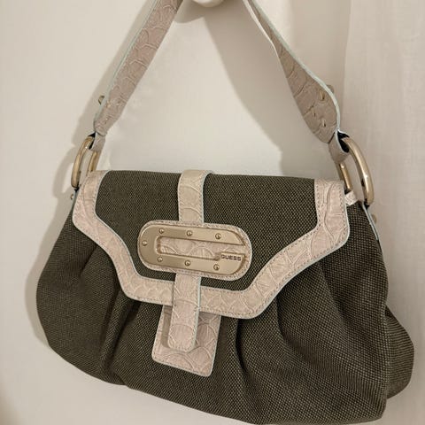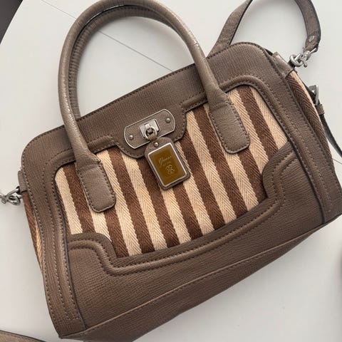 GUESS Dame veske fra ca 2006/2008. Svært lite brukt, jeg finner lite synlige bruksmerker. Vesken har håndtak og avtagbar skulderrem, flere rom med glidelås og klaff med knapp. 80% polyester og 20% bomull.