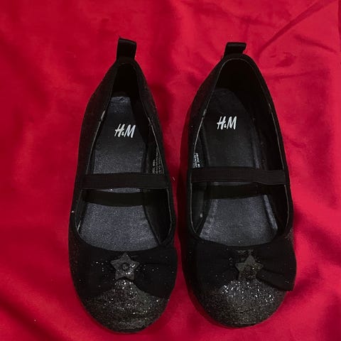 Høyt elskede pensko som har blitt for små. Regnbueglitterfarge og prinsessemotiv inni. Enkle å få av og på selv på grunn av borrelåsen.