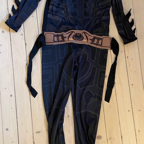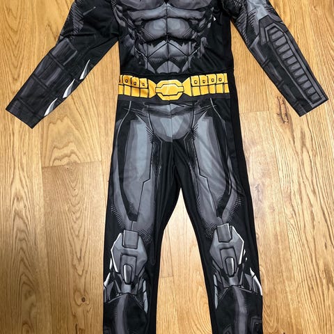 Batman Barneklær Kostyme i størrelse 122. Kostymet har detaljer som etterligner Batmans drakt, inkludert trykt mønster som viser muskulatur og belte, samt en kappe i svart stoff. Passer for barn i størrelse 122.