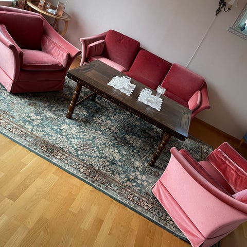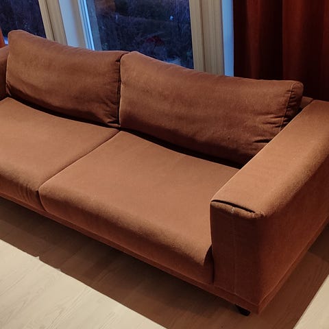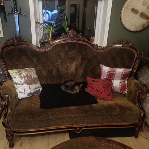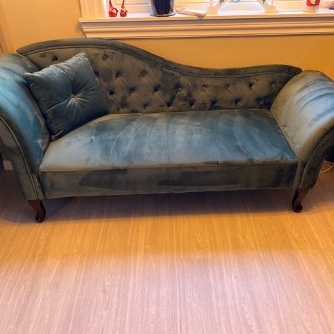 Plettfri antikk sofa, i nydelig gyldent velourstoff. Ingen feil eller mangler, fremstår helt suveren. Selges med tungt hjerte da vi ikke finner riktig plass til den.