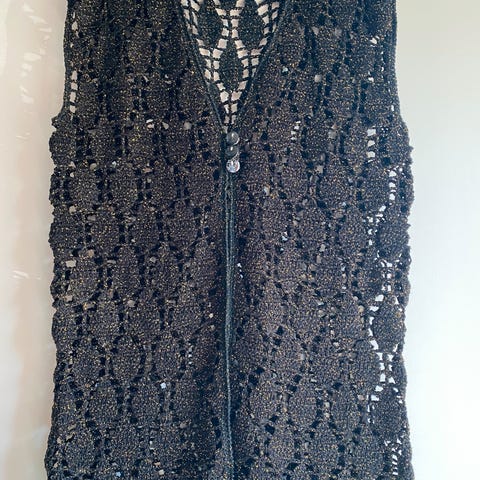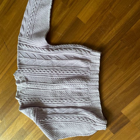Hjemmestrikket genser i bomull. Den ble for stor, og er ikke brukt. Se oppgitte mål på siste bilde.