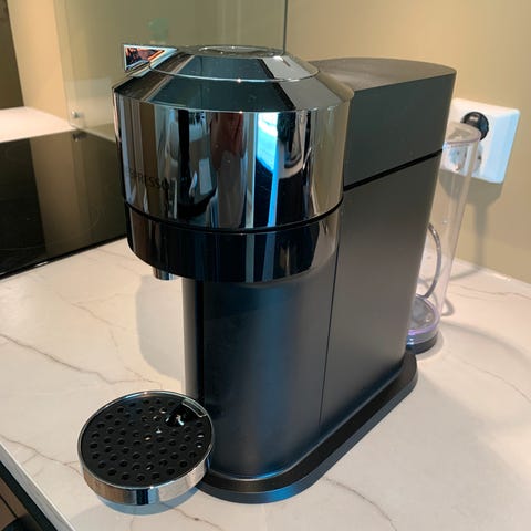 Nespresso Vertuo Next kaffemaskin i rød farge. Maskinen er designet for å brygge kaffe med Nespresso Vertuo kapsler. Den har kompakt størrelse og moderne utseende, egnet for hjemmebruk. kommer med fire kopper , to store og to liten