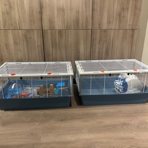 • Stort, to-etasjes hamsterbur i glass, metall og tre