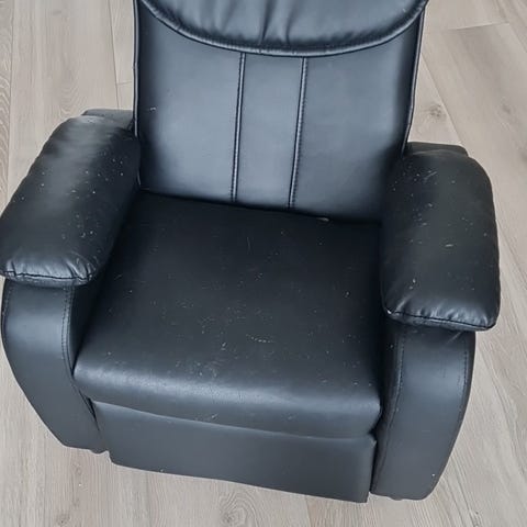 Lenestol / recliner til barn selges da ungene har vokst ut av den. Kan legges tilbake med fotskammel som vipper ut. Noen bruksmerker, se bilder, men ellers fin.