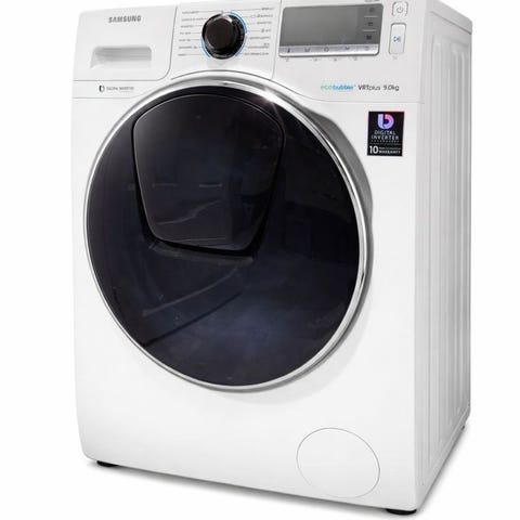 Samsung Frontmatet vaskemaskin med frontåpning. Maskinen er designet for effektiv klesvask med enkel betjening via kontrollpanel og dreiebryter. Fargen er hvit, og den har en stor døråpning for enkel tilgang til trommelen.