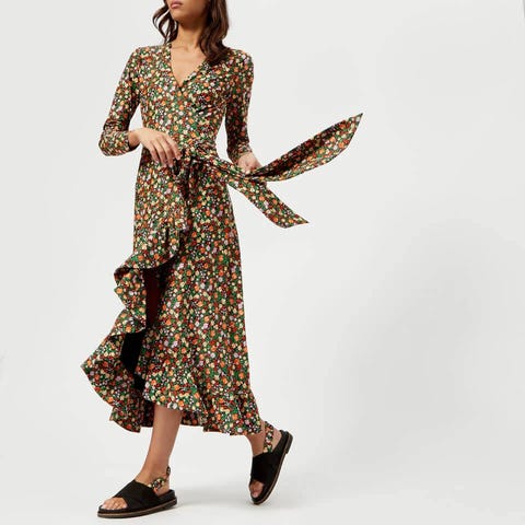 GANNI Alameda omslagskjole i str. 36. Passer XS, S og liten M siden det er litt stretch i stoffet og det er omslagskjole. Nydelig blomstrete stoff som faller pent med noe tyngde. Strykefritt materialer, skrukker ikke. Kan dresses opp og ned og passer til hverdag og fest.