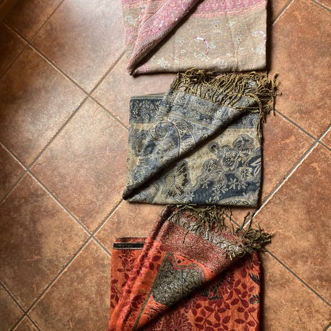 6 sjal i ulike fargar. Det grøne har mønster med mange små hestar. Det er slitt på kanten (bilde) men slitt gjevnt. Så det vert som ein del av mønsteret.