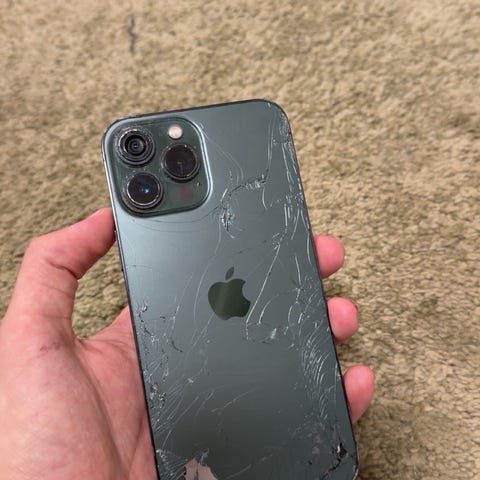 Alt virker som det skal, selv om det er skader på baksiden. Skjermen er intakt.