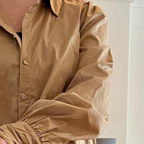 Ubrukt pga feil str. Str L, men liten i str. Blusa vil passe en 38/40 str perfekt. Rett fasong. Aldri brukt. Lekre knappedetaljer. Bomullspoplin. Fra et dyre og røykfritt hjem.