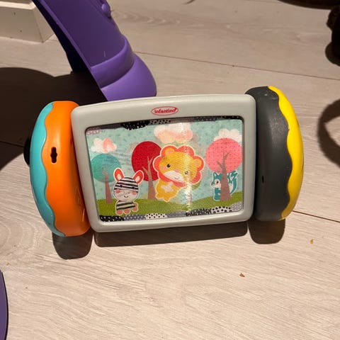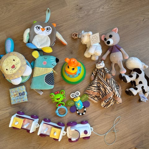 barnleker med ulike former og farger, inkludert former som kan settes inn i tilsvarende hull, stableklosser og en fjernkontroll-lignende leke. Passer for små barn og bidrar til utvikling av motoriske ferdigheter og formgjenkjenning.