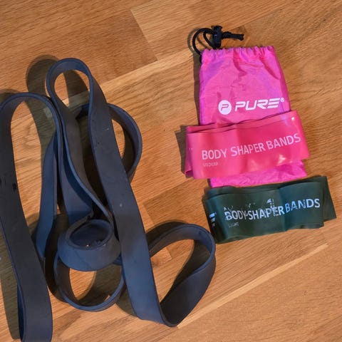 Pure Body Shaper Bands treningsstrikker i sett med tre nivåer av motstand: lett, medium og tung. Båndene er laget for kroppstrening og styrkeøvelser, og leveres med en oppbevaringspose i rosa. Fargene på båndene er grønn (lett), rød (medium) og grå (tung).