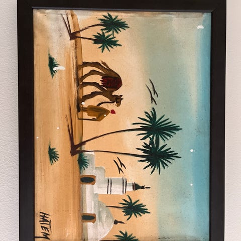 Landskapsmaleri som viser en strand med klipper og en dramatisk solnedgang. Maleriet har varme farger og er montert på vegg i et rom med hvite panelvegger og skråtak. Cláude Monet fotoprint mål 120x80 cm . Ailly point low tide. Vi har akkurat kjøpt dette , men det passet dessverre ikke helt med interiøret . Ny pris 2300kr.