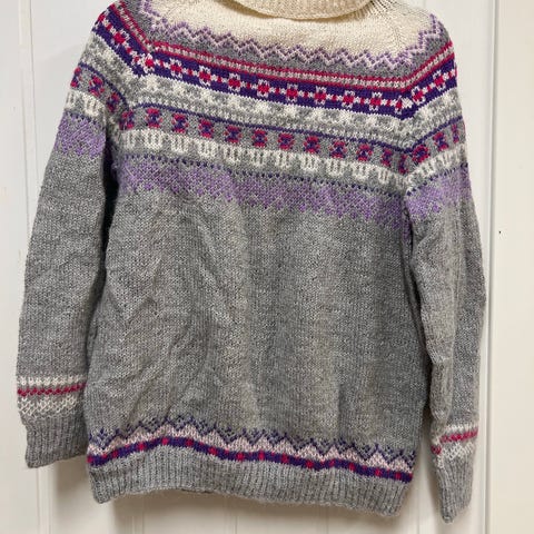 Fin hjemmestrikket genser selges. Motiv med ulver/hunder og mønster. Brukt kun en gang. Kjøpt for 1700kr.