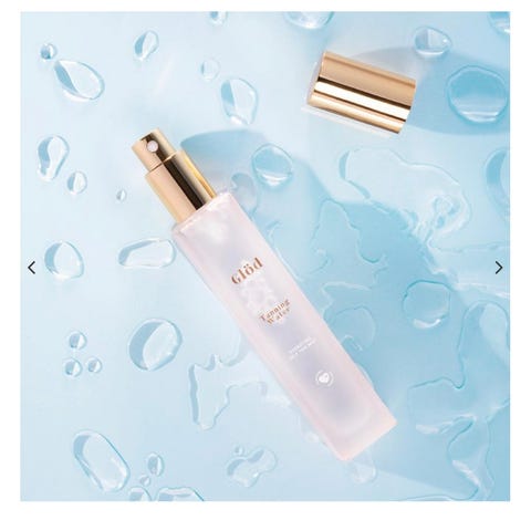 Glöd Tanning Water selvbruningsvann. Produktet kommer i en rosa eske og flaske med gullfarget kork. Egnet for hudpleie med fokus på gradvis brunfarge.