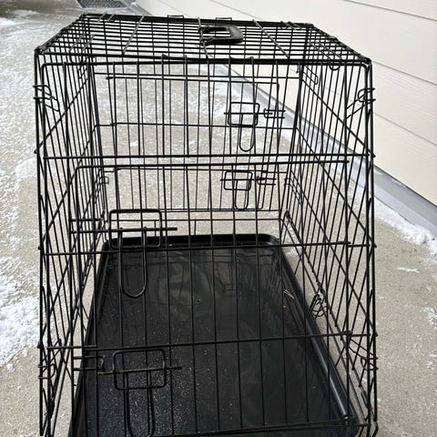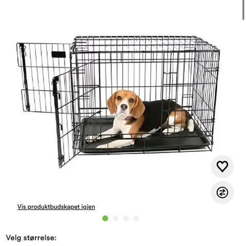Dette er et hundebur laget av metall med en plastbunn. Buret har dør på langsiden og ene enden og er utformet for å gi et sikkert og praktisk oppholdssted for hunder. Egnet for innendørs og utendørs bruk. Buret er sammenleggbart for enkel transport.