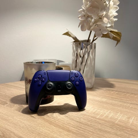 Sony DualSense spillkontroller holder i blå plast. Holderen har et unikt design med flere spisse elementer og er laget for å støtte og oppbevare en spillkontroller.