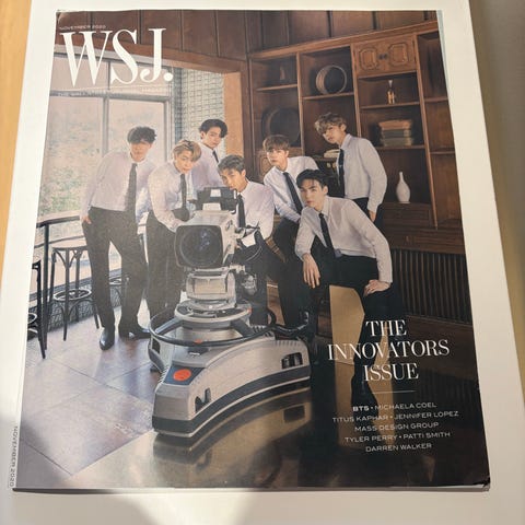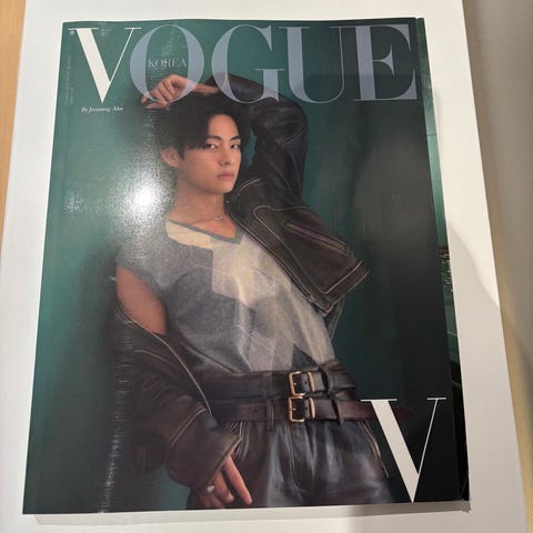 Vogue Korea magasin med gruppebilde av bts på forsiden. Publikasjonen er en del av Vogue-serien gitt ut Jan 2022.