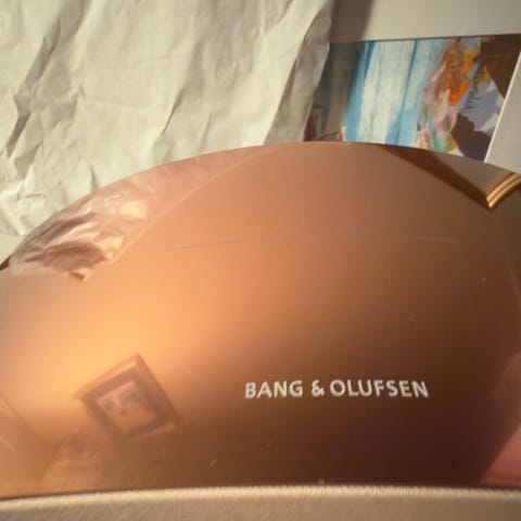 Bang & Olufsen høyttaler med stoffdeksel og rektangulært design. Passer til lydavspilling i hjem eller kontor.