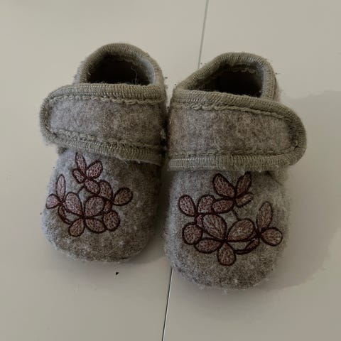 Gode og varme tøfler som er gode å krabbe og gå med. Skinn under. Sålen inni mangler, men det går fint å bruke dem (selges derfor billig). Borrelås på siden som gjør dem lett å regulere.