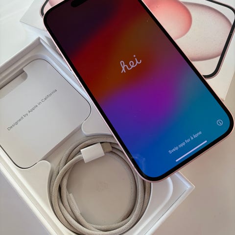 Apple iPhone 15 Pro mobiltelefon med 128 GB lagringskapasitet. Enheten har en skjerm med kant-til-kant-design og flere kameraer på baksiden. Fargen er sølv/grå. Passer for brukere som ønsker en mobiltelefon med høy lagringskapasitet og avanserte kamerafunksjoner. Batteri kapasitet 90%