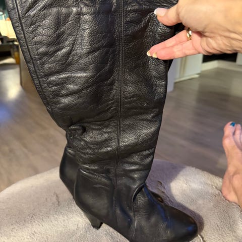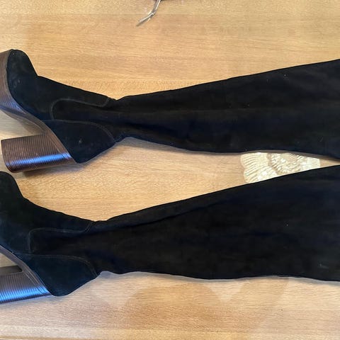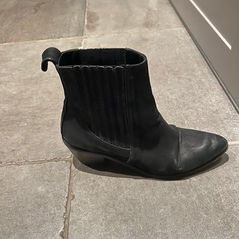 Pene lær-støvletter som har vært gode følgesvenner gjennom mange år. Selges til fordel for nye og lavere heler. Støvlettene har en fin patina, rekker til midt på leggen og er stilige til jeans. Litt spiss tupp og middels høye heler. Str. 39. Pusses før salg.