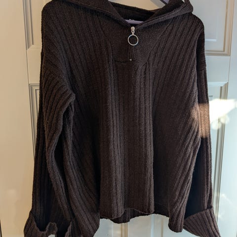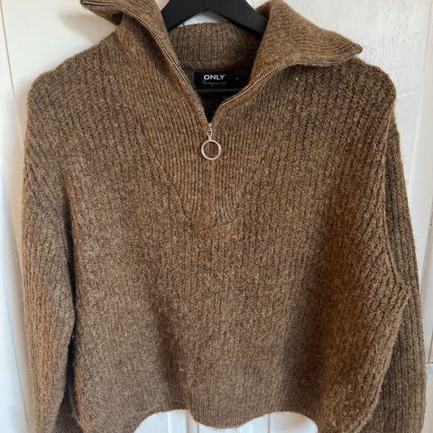 Høyhalset zip genser i størrelse medium fra Only. Kjempefin lys gråfarge. Modellen er kort i lengden ellers normal i størrelsen.