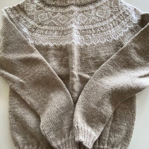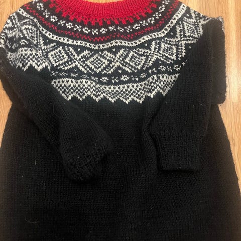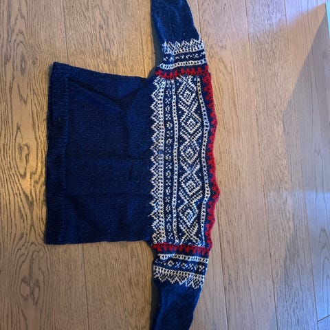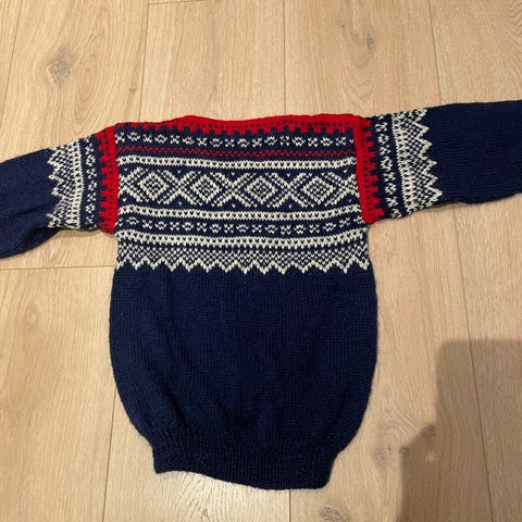 Pent brukt hjemmestrikket genser i Marius mønster. Ca str 116 (6-8 år).