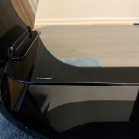 Overflater i rustfritt stål og glass. Skuffer i begge bord. En liten skade på siden av tvbordet.