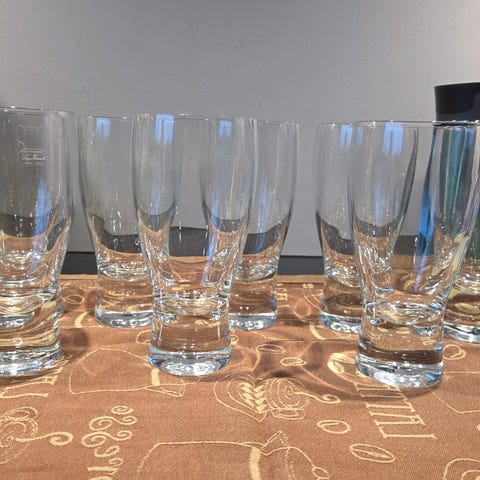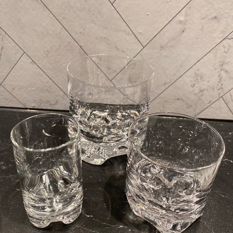 Ai: "Laget av blyfritt glass av høy kvalitet, kjent for sin optiske klarhet. Kjennetegnes av en solid, tung base og tykt, støpt glass som gjør det slitesterkt. "
