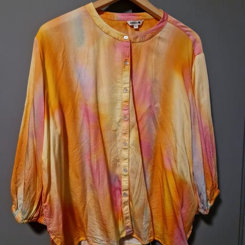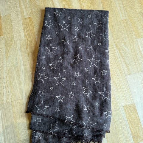 50 % ull og 50 % silke. Pent brukt. Kremfarget bunn med mønster i oransje store prikker. Små frynser på endene.