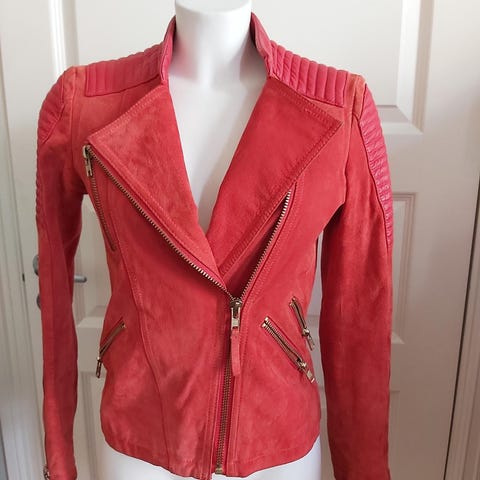 Selger en skinnjakke fra merket Jazz. Tror foret er polyester og ytterstoffet lær, men står ikke hvilke materialer det er (står på «vaskelappen» at læret må vaskes av lærspesialister, så antar at det er lær i ytterstoffet også er det polyester eller lignende i innerstoffet)
