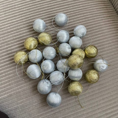 Bilde 1-2: 4 julekuler i stål. Vekt 77gr.,9cm diameter. Kr 100 pr stk. Bilde 3: Glass istapper, lengde 20cm, pris pr stk kr 75. Bilde 4: Hard plast, 2 stk "grener" 16cm, en snøkrystall 15cm diameter, kr 25 pr stk.