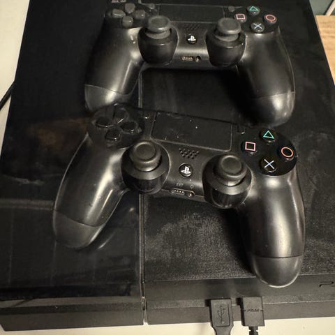 PlayStation 4 konsoll med rattkontroller og pedaler for kjøring, samt to trådløse kontrollere.