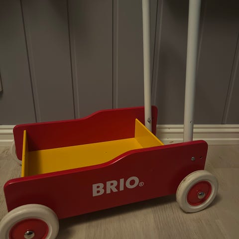 BRIO 31350 gåvogn i rød farge. Laget i tre med hjul for enkel bevegelse. Designet for små barn som støtte ved gange.