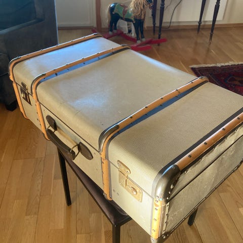 Stor Gabol-koffert i rødt stoff. Mål: 77 × 47 × 27 cm. Det er plass til veldig mye inni. Når kofferten er helt full, kan den være litt vanskelig å trille. Innerstoffet er revet, men dette påvirker ikke bruken. Selges fordi jeg har fått en ny i gave.