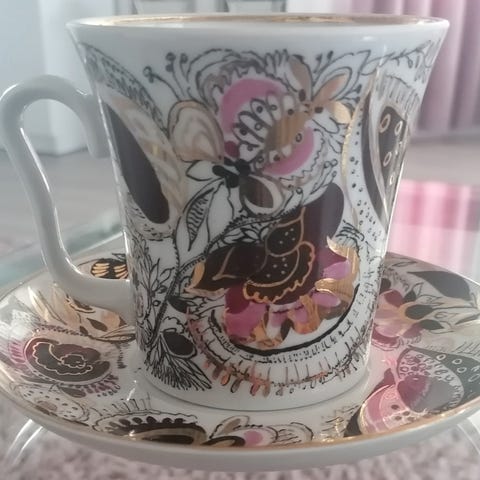 Elegant og detaljert kaffeservise fra Japan, sannsynligvis fra 1950–1970-tallet. Motiv av lilla blomster (wisteria) med gullkant og bølget form. Hver del er håndmalt og unikt dekorert.