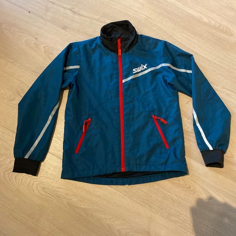 Swix barn jakke i blå farge, laget av polyester og nylon. Meget pent brukt. Jakken er unisex og passer barn med størrelse 128.