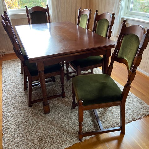 Spisebord med tilhørende fire stoler. Bordet har en rund form og en lys overflate. Stolene har polstret sete og rygg, og er i en lys farge. Passer til spisestue eller kjøkken.