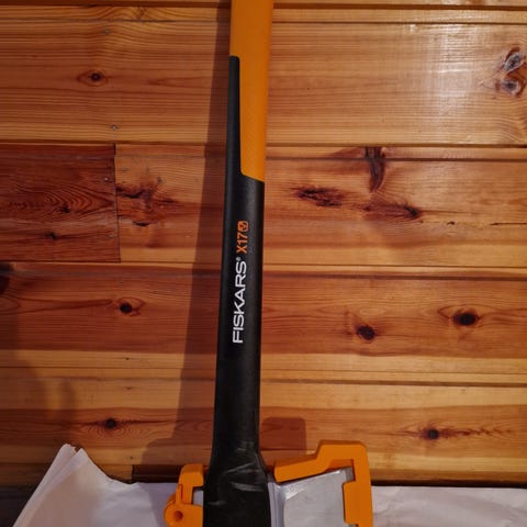 Fiskars øks med sort skaft og metallblad. Egnet for vedkløyving og annet arbeid som krever en øks. Bør slipes.