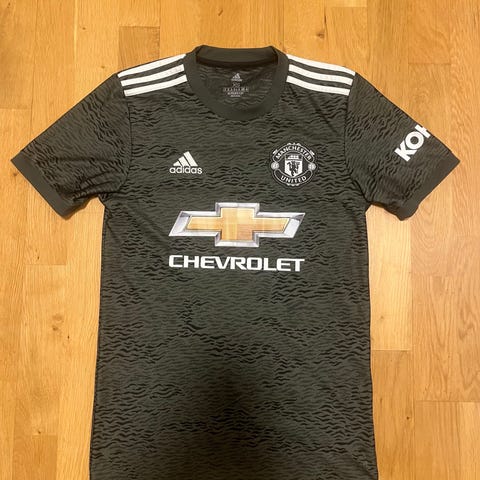 Nike Manchester United fotballtrøye i størrelse M, med blå og svarte horisontale striper. Designet for menn og egnet for fotball.