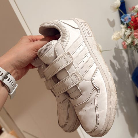 Pent brukte Adidas innendørssko i størrelse 33 selges. Klassisk hvit modell med svarte striper og gummisåle – perfekt til gym, håndball, innebandy eller skolebruk.