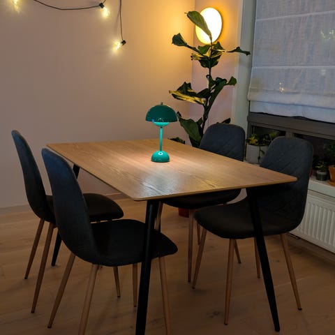 Det finnes noen kosmetiske bruksspor på bordplaten i form av lette riper/merker (se bilder), men dette påvirker ikke funksjon eller stabilitet.