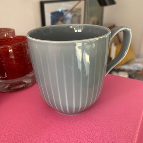 1 krus - Kähler Hammershøi kopp med en kapasitet på 33 cl i fargen antracitgrå (antrasitt). Laget av keramisk materiale med et karakteristisk linjemønster. Egnet for daglig bruk som drikkekopp.
