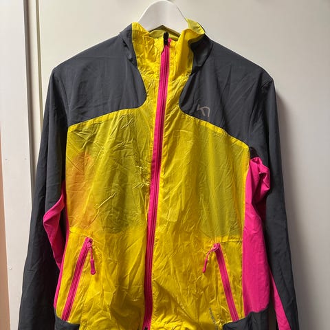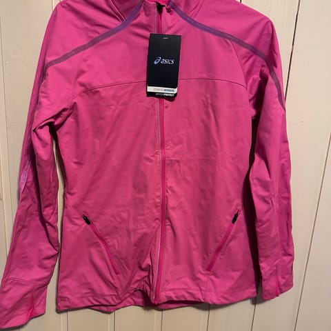 Asics løpejakke for dame i størrelse M. Jakken har flerfarget mønster med hovedfarger i gult, rosa og lilla. Egnet for løping og laget med materialer som gir komfort under aktivitet.