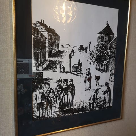 Middelaldrebilde fra Bergen, 65x75cm. I glass og ramme. Ser ut til å være fra Dreggsallmenningen med Mariakirken i bakgrunnen.