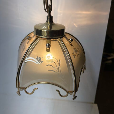 Fra mitt barndomshjem selger jeg en nydelig lampe med solid oppheng. Vintage taklampe i lett sotet glass og messing, tror jeg. 80-talls lampe.