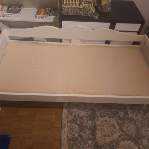 Høg seng, 90x200, med uttrekkbart skrivebord.