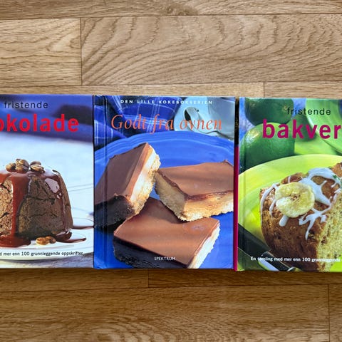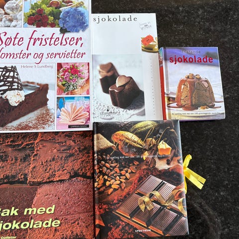 Sjokoladekunnskap, sjokoladekaker, sjokoladedesserter desserter. Bøkene er på norsk, noen på svensk , dansk, tysk og engelsk. Selges 50 kr per bok. Kan sendes