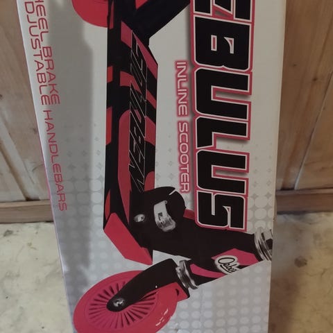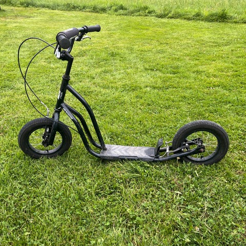 Stiga sparkesykkel med gul og svart farge. Utstyrt med håndbremse og luftfylte hjul. Passer for barn og unge. Bremser bør gåes over/ strammes