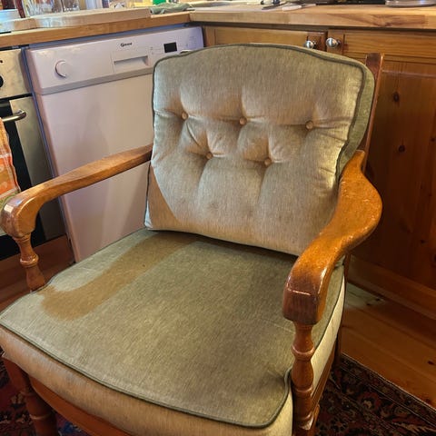 Pent brukt lenestol selges, mangler en skrue og har litt malingsflekker. Veldig god å sitte i! Puffen følger med.